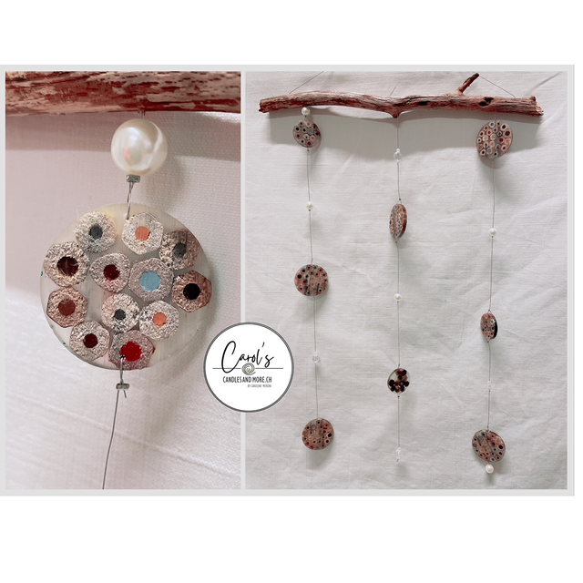 3 Metallherzen, Wachsperlen, Feder an Natur-Ast